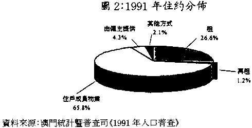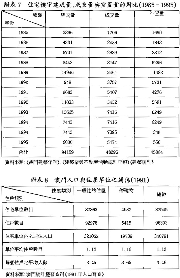 按1991至1995年本澳樓宇落成單位47854個,1991年人口普查一般性住宅單位的82863個合計共130717個。若1991年至1995年落成的單位能被市場完全消化,而且1996至1999年至少新建成9035 個單位,亦落入用戶手中的話,那麼澳門地區的房屋供求可達到基本平衡。