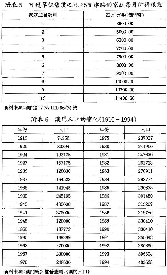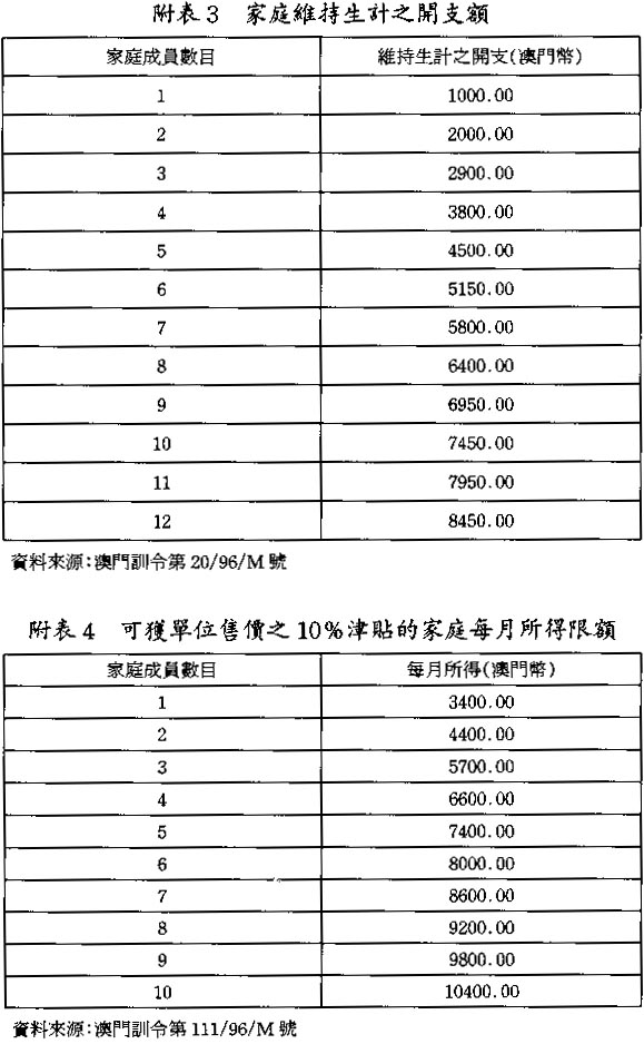 再次,按統計曁普查司資料顯示,1993至1994年的澳門家庭每年平均收入在3萬元以下的低收入家庭(佔全澳家庭的9.2%)對住屋類開支方面最重,佔其收入的45.32%(附表9),(17)又當年的銀行利率爲0.875,以還款期限15年計算,向銀行借款30萬元,每月還款額接近$3000.00元,對低收入階層來說,要在自由市場擁有一個自住單位,存在一定困難。所以,經濟房屋的需求自然殷切。