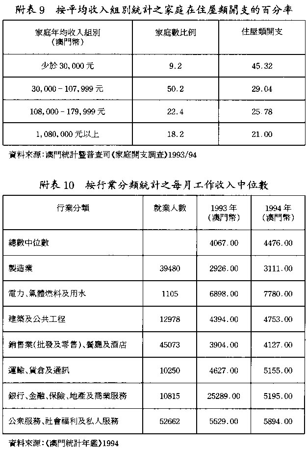 隨此,1994年澳門的就業人數共有172969人,各行業平均每月薪金收入的中位數爲$4476.00元,其中製造業、建築及公共工程業,以及銷售和餐廳及酒店業的就業人數合計共97533人,佔總就業人數比例的56.4%,(18)但這些行業的每月工資中位數$4476.00(附表10)低於$5150.00元,澳門政府於1994年(1996年2月5日調整爲$6300.00 元)規定一般4人家庭申請租住社會房屋的每月所得的最高限額,(19)假如這些家庭中祇有一個成員工作且服務於上述行業,他們是完全有條件租住社會房屋。