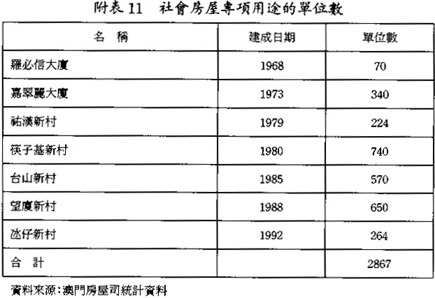 澳門房屋的建設和政策,也是隨着人口而發展。據1991年統計數字,一般性的住宅單位爲82863個,每單位內平均住戶數爲1.12戶,僭建物(木屋)的單位數爲4682個,每單位內平均住戶爲1.16戶(附表8)(15)
