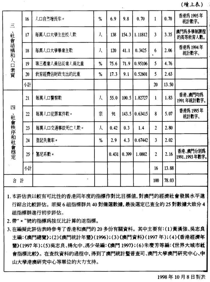同時我們也必須看到,與香港相比,澳門的劣勢和問題是明顯的、不容忽視的。首先,澳門雖爲自由港,但由於周圍水域淤淺;雖有貿易自由卻缺乏深水良港。在25個評估指標中,得分最低的後兩位是“人均港口貨物吞吐量”(得分爲0.06604,不包括內河港口和航空港)和“出口依存度”(得分爲0.22906)。這兩項與香港相差懸殊,明顯地暴露了澳門在海港和貿易方面的劣勢和問題。其次,在四組指標群中,加權得分最低的是“社會結構和人口素質”這一組。這充分表明,澳門的社會結構和人口素質對經濟發展以及各方面的發展起着明顯的制約作用。澳門的有識之士近年已意識到了這一點,所以進入九十年代開始大力發展敎育、科技事業。再次,澳門的社會治安的惡化已經成爲經濟社會發展特別是旅遊、投資的一大阻礙因素,“每萬人口犯罪案件數”竟相當於香港的1.6倍(參見表1)。