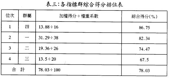 “生活質量”這一組共有8個指標(參見表1)。其中,有3個指標高於香港:“人均藏書量”得分爲2,即相當於香港的2倍;“每百人擁有汽車”得分爲1.29762,“每千人口醫生數”得分爲1.26667,這兩個標都超過了香港。“人均預期壽命”得分0.97208,雖低於香港但卻高於澳門的綜合發展水平。此外,還有兩個指標接近綜合發展水平,有兩個指標得分在0.5以下。這一組的權重系數爲26,加權得分爲19.36,即澳門的“生活質量”相當於香港的74.47%(參見表3)。