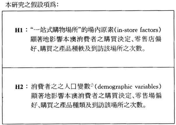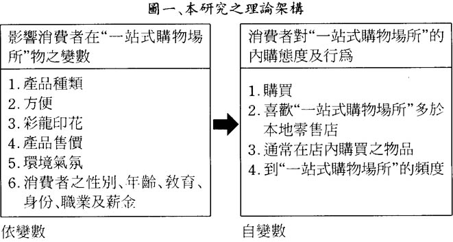 硏究消費者在零售場所內的購物行爲,最基本需要了解其行爲的背後“促使購物動機”(PATRONAGE MOTIVES)。HARLEY於1980年文章中把消費者在零售場所內的“促使購物動機”解釋爲“購物的理由”,而這些理由包括“購物時之方便度”、“產品種類”、“產品的質量及時尙感”、“產品價格”及“服務”。此外,MEYER等人更於1988年一編文章發表,把“促使購物動機”與“從場所得之利益”拉上了關係。總括來說,本硏究的理論架構分從圖一顯示。