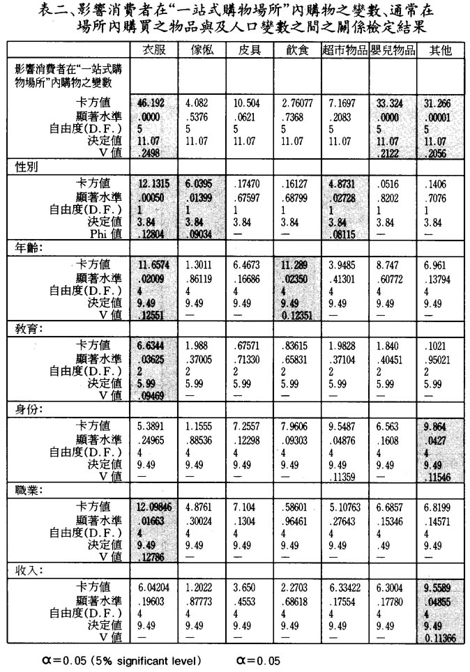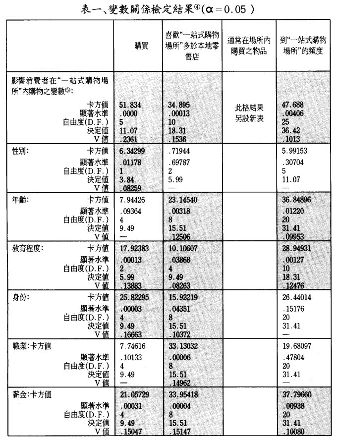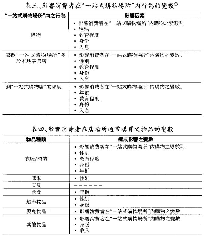 表三及表四顯示了此硏究的最終結果。從表三內所發現,消費者在一站式購物場所內的“眞正購買決定”受到場所內因素所影響。例如場內所提供的產品物類之多少、店址方便程度、換物卷、產品訂價、舒適環境等。而此“眞正購買決定”的決定與被訪者本身的性別、敎育程度、身份及收入卻具顯著的關係。認爲喜歡“一站式購物場所”多於本地零售店的被訪者與場所內所提供的產品物類之多少、她/他們的年齡、敎育程度、身份、職業及收入亦存在顯著的關係。而表三最後一項被訪者到“一站式購物店”的頻度則與場所內所提供的產品物類之多少、她/他們的年齡、敎育程度及收入存顯著的關係。