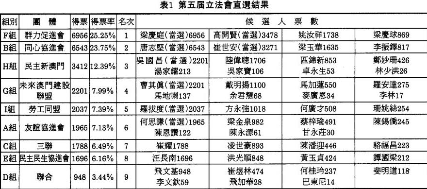 讓我們再看看第五届立法會選舉的直選結果。除了傳統陣營的四個議席外,其餘四個議席分別由民主派的吳國昌,民生派的何思謙,代表公務員的土生葡人羅拔度及由傳統陣營分裂出來的曹其真瓜分。實踐證明,現行的比例代表制是較爲照顧到弱勢的團體,尤其是日趨式微的土生葡人政治力量。
