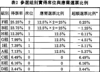 * 以各組別所得的選票數目除以選舉商數就得出各組別的應得席位。如F組所得選票是6956,應得席位是6956÷3566(選舉商數)=1.95。