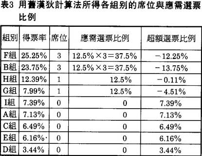 我們試用1992年澳門立法會的選舉結果,比較新舊的漢狄計算法,看那一種計算法比較接近比例代表制的理想選票分配。澳門立法會有八個直選席位,每席所需的選票比例應該是100%÷8=12.5%。如表2所示,用新的漢狄計算法,除了C、E及D三組分别因不獲得任何席位而損失所有的選票之外,祗F組群力促進會有輕微的“超額損失席位”,該組的得票率比所得的席位数目比例僅多出0.25%。其他獲得席位分配的各組别都是“超額獲得席位”,但問題不算太嚴重,最少票的A組友誼協進會亦祗超額5.37%。但是如果採用舊的漢狄計算法,“超額獲得席位”的現象就十分嚴重。F組及B組同心協進會分别超額12.25%及13.75%(見表三)換言之,F組及B組各自“白得”分配一個席位。