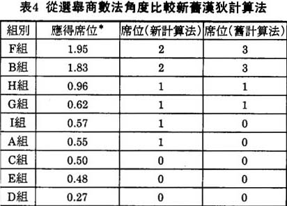 如用“選舉商數”或“當選商數”法計算,比較新舊漢狄計算法的優劣,所得的結論亦是一樣。所謂選舉商數法,就是以席位數目除有效選票数目以決定“選舉商數”③。當一組候選名單所得的選票達到此商數,便獲得一席位,所以又叫“當選商數”。譬如,澳门1992年立法會有效選票数目是28,526,而直選席位数目8個,所以“選舉商數”是28,526÷8=3566。從表四我們可以看出,如從選舉商數法的角度來看,F組群力促進會及B組同心協進會應分别獲得分配1.95及1.83席位,而H組民主新澳門應得0.96席位,其餘G組0.62席,I組0.57席,A組0.55席,C組0.50席,E組0.48席及D組0.27席。很明顯,用選舉商數法計算出來的應得席位是比較接近用新的漢狄計算法計算出來的實得席位。如用舊的漢狄計算法,F組及B組會分别“白得”一席,而應獲分配超過半席位的I組及A組就一席位都拿不到,這是很不公平的。