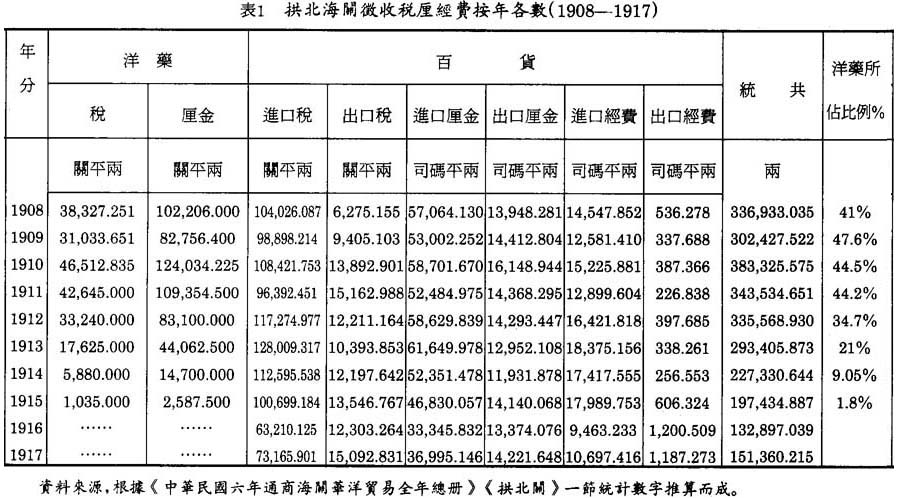從表一中可看出,在1911年以前,洋藥税厘與百貨稅相比,大致相等,祇是少幾個百分點。但到了1915年後急劇下降,洋藥所佔比例僅百分之一點八,此後幾無洋藥税厘可徵,完全轉向徵百货税。
