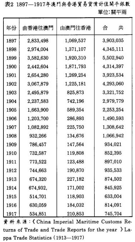 在洋藥税厘併徵及其他货物交往方面,澳門和香港之間的合作是一對親密的伙伴,從1897-1917 年港澳雙方往來的貿易货價計値相比較,從香港輸往澳門的貨値比澳門輸往到香港的货値起碼多出一倍甚至數倍,見下表(表2):