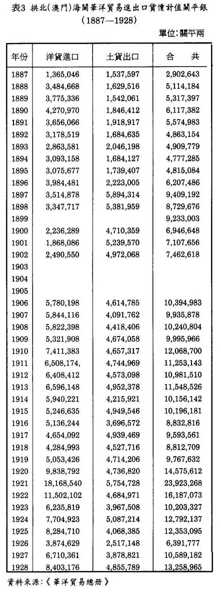 中國海關一直爲帝國主義所把持,關税爲洋人所掌握。在1927年4月,當民國政府在南京建都後,決定實行關税自主,截止1928年12月27日止,包括葡萄牙在內的各资本主義國家(日本例外)均次第簽約,承認中國關税自主權。爲此,本文將1928年以前的拱北海關劃爲洋關時期(即海關總稅務司控制時期)。根據《華洋貿易總册》所提供的寳貴资料,整理輯錄成下表(見表3),從中可看到拱北(澳門)海關進出口業務之全貌。