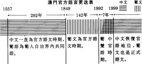 (3)1992年至1999年12月20日,葡語延續爲澳門官方語言的同時,“中文在澳門具有與葡文同等之官方地位及法律效力”(第455/91號法令)。這7年,是一個過渡期。它開始了葡中雙語行政的時期,實際是葡主中輔期。