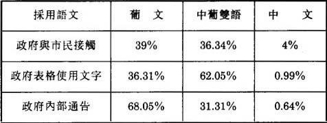 在實際使用上,我們可以參考澳門公務專業人員協會1993年7月的一份調查問卷。其中關於政府與市民接觸所採用的語文情況:(該調查向本澳34個司職員中以中文爲母語的350人發出問卷,收回315份)