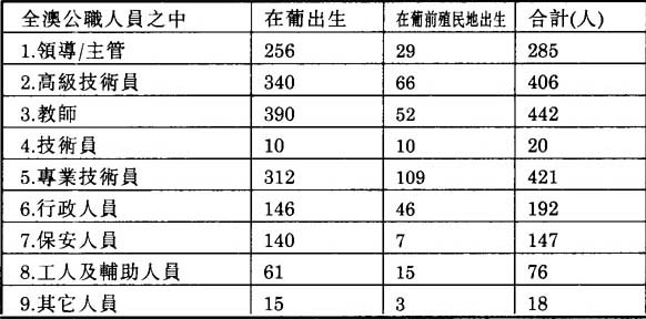 按《91澳門公共行政人力資源》的資料顯示:1991年,全澳15,371名公職人員,葡國出生的1,679人,前殖民地出生的337人,合計2,016人,佔13.12%。他們文化水平較高,在政府任職分佈情況也以高層次爲主: