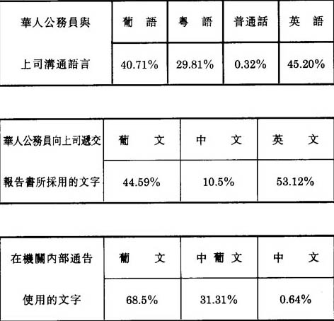 上述的1993年7月的華人公務員的調查中,其上司是葡人的佔68.86%,屬土生葡人的佔17.05%,加起來超過4/5,而在公職人員內部上級的溝通,採用英語的比率最高。