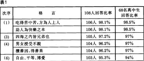 1 從道德格言的傳遞率來看,最高的達不到100%,最低的也有30%,(見表1)