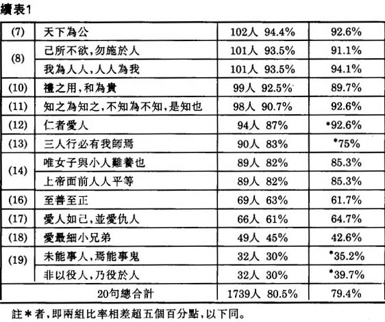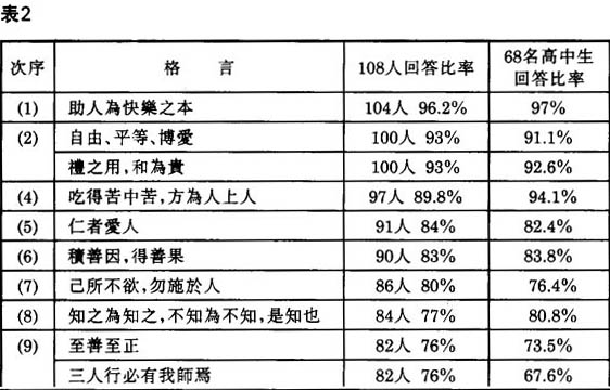 1.列出近百年,澳門社會及各類學校曾經傳遞的道德格言20句,要求調查對象對每句作三個回答:(1)是否聽過?藉此了解其傳遞的廣泛性。(2)是否贊同?(主持者必使調查對象了解每句的本義)藉此了解其敎育效果。(3)是否孔子的話?藉此了解調查對象對東方傳統倫理道德源流——孔子思想、著作接觸的情況。