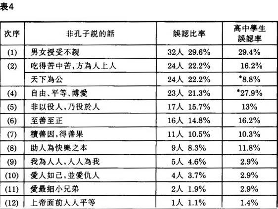 (2)對12句並非孔子說的話,不少誤認爲是孔子的原話,依錯誤多少排列如下:(表4)