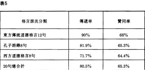 1 從道德格言分類的傳遞率來看,(見表5)東方傳統道德格言12句,傳遞率達90%,這是一個十分高的比率。孔子語錄8句,其傳遞率也達81.9%,其贊同率達65.3%。作爲一距今2,000多年的思想家、敎育家,在一個走向現代繁榮的都市裏,他的格言仍然深入人心,可見澳門華人的傳統道德觀,也是以原始儒學爲核心的。20句中贊同率最高的兩句“吃得苦中苦,方爲人上人”,“自由、平等、博愛”均有1/5以上的人,誤認是孔子的話。在百年史上,每一次批孔的思潮,在澳門均同時有所影乡響,但至今在澳門靑少年一代的心目中,孔子的正面影響還是較大的,說明原始儒學的現代生命力的存在。