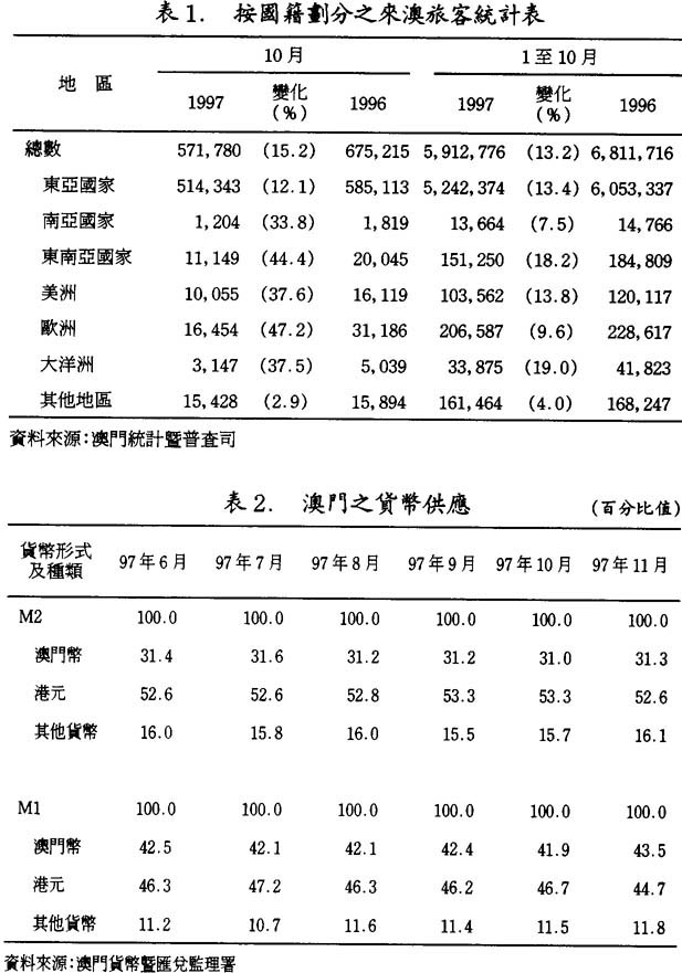 澳門的零售業近年來本已隨着內部消費放緩而萎縮,鄰近地區如珠海的零售業發展亦形成市場的沉重壓力,經過金融風暴的洗禮,東南亞國家及香港來澳之旅客大爲減少,本澳市民的消費意欲亦大不如前,進一步打擊本地的零售業。本澳的旅遊業自1997 年初以來,已因爲社會治安惡化而呈現不景,來澳旅客持續下降(詳見表1),嚴重影響了食肆及娛樂場所的營運,是次金融風暴更令澳門的旅遊業雪上加霜。澳門的出口在1996年已有所放緩,在受配額的保護下,澳門的出口雖然在近年來受到東南亞、中國等市場廉低勞動力所帶來的競爭,但仍然能維持一定增長,是次金融風暴,無形中使東南亞諸國的出口競爭力進一步加強,使澳門出口受到打擊。