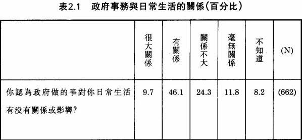 當被問及政府事務對日常生活的影響,55.8%的被訪者認為政府所做的事對他們日常生活有“很大關係”或“有關係”;祇有24.3%的被訪者認為“關係不大”和11.8%認為“毫無關係”(見表2.1)。市民認為政府所做的事是否與他們的生活有關,可直接衡量公共事務在普羅大衆之中的重要性。②我們的調查結果顯示澳門華人相當關心政府事務。香港同類型的調查結果顯示相同的政治取向。在1991年的一次問卷調查中,29.9%香港人認為立法局的活動與通過的法律與他們的日常生活有“很大關係”,50.2%則認為“有關係”。③相對來説,在同一個問題上,認為政府事務對他們日常生活有“很大關係”或“有關係”的美國人、英國人、德國人、意大利人和墨西哥人分别為85%、73%、70%、54%和30%。④日本人,跟美國人和英國人一樣,十分關心政府事務。⑤