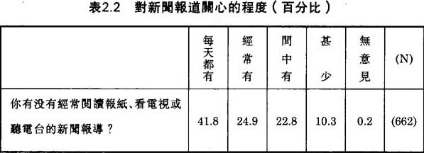 表2.2顯示出41.8%的被訪者“每天都有”和24.9%的被訪者“經常有”留心報紙、電台或電視台的新聞報導。這個比率比得上在香港、中國大陸、日本、美國和其他地區類似的調查。⑥但是,令人大惑不解的是,53.6%被訪者不知道或答錯新上任澳督的名字。這個調查結果很令我們震驚,因為當這個問卷調查正在進行中的時候,新澳督韋奇立剛上任,澳門傳媒曾對此盛事作大篇幅的報道。可能的解釋是,很多澳門人平常祇收看或閲讀香港的傳媒。