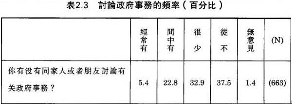 同樣令我們覺到失望的是,澳門人一般很少有興趣或願意與别人討論政府事務,如表2.3所示,祇有5.4%的被訪者回答他們“經常有”同家人或朋友討論有關政府事務;22.8%的被訪者回答“間中有”;超過七成表示“很少”或“從不”同家人或朋友討論政府事務。同香港華人比較,澳門華人比較少與别人討論公共事務,根據一個調查研究,22.6%的香港華人經常同家人討論公共事務,41.2%則經常與朋友討論公共事務。⑦