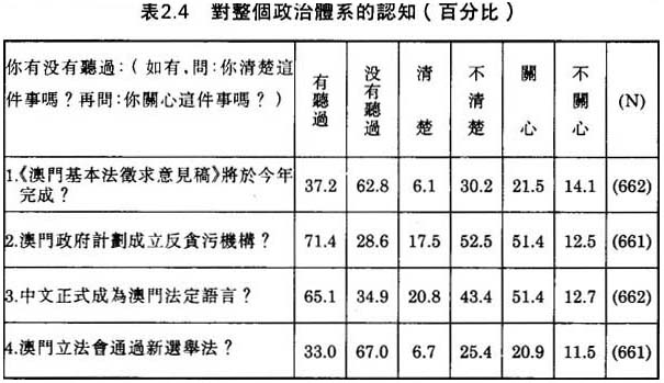 我們設計了一系列的問題,去查探澳門大衆市民對澳門整個政治體系的態度取向。這些問題差不多涵蓋了整個政治體系的要素:總督、立法會、司法制度和社會制度;同時包括了政治文化的要素:澳門人對整個政治體系的認知、情感和評價取向。