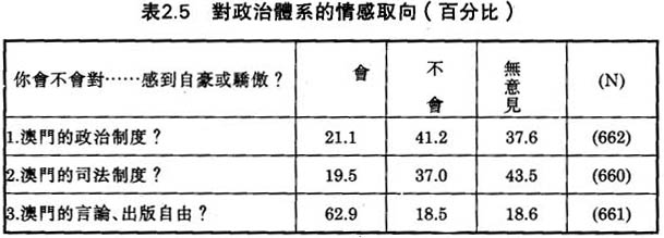 我們設計了幾條問題去調查澳門華人對整個政治體系的情感取向。調查結果顯示澳門人對他們的政府感情複雜,不是三言兩語可以説得清楚。對澳門的政治制度,祇有21.1%的被訪者感到自豪或驕傲(見表2.5)。這是頗為負面的答案。同樣,澳門人對澳門的司法制度評價不高;低有19.5%的被访者對澳門的司法制度感到自豪。另方面,我們的被訪者對澳門的言論和出版自由頗為滿意;62.9%的被訪者對澳門的言論和出版自由感到自豪。
