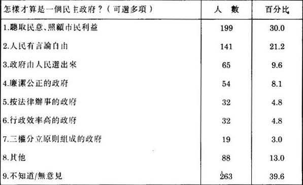 ③見JERMAIN T.M. LAM AND JANE C.Y. LEE, RESEARCH REPORT ON THE POLITICAL CULTURE OF THE VOTERS IN HONG KONG PART II: A STUDY OF THE GEOGRAPHICAL CONSTITUENCIES OF THE LEGISLATIVE COUNCIL, DEPARTMENT OF PUBLIC AND SOCIAL ADMINISTRATION, CITY POLYTECHNIC OF HONG KONG, APRIL 1992, P.21.