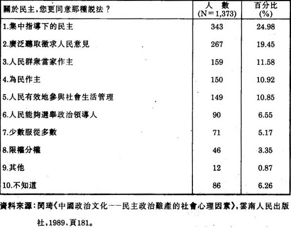 認為一個民主政府最重要的是“聽取民意、照顧市民利益”的民主觀,對了解中國人的政治文化,很具啟發性。在香港類似的調查研究,在同一個問題上,最多香港人選擇的答案亦是一個聽取民意、照顧市民利益的政府。(13)香港和澳門華人對民主概念這種相同的特殊理解,絶對不是偶然的。如果我們再比較港澳兩地同中國大陸公民對民主的認知,這種共通性就更突出了。在1987年舉行的一次全國性問卷調查中,被訪者被問:“關於民主,你更同意那種説法?”四分之一的被訪者選擇“集中指導下的民主”;其次二成選擇“廣泛聽取、徵求人民意見”。祇有6.6%選擇“民選政府”,最少人(3.4%)選擇“三權分立”(見表2.7)。“民主集中制”是中國大陸長期以來實踐的唯一的政治制度,在意識形態及教條主義的影響下,“民主集中制”的優點被長期肯定下來。所以最多中國公民選擇“民主集中制”並不令到我們感覺意外。而最令我們感覺興趣的是大陸中國人的第二個選擇。雖然生活在兩個完全不同的政治社會制度下,大陸、香港和澳門的華人同樣強調一個民主政府應該“廣泛聽取民意”。
