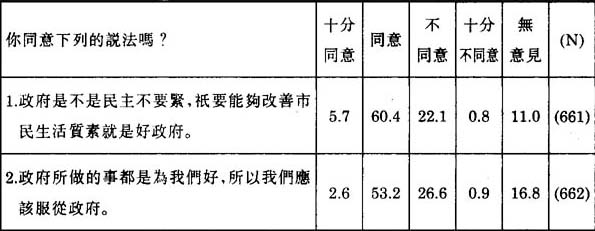 誠然,這種以物質標準來衡量一個政府的表現的傾向,並不是澳門人獨有。在1987年一次全國性的問卷調查中,74.1%的國內被訪者同意“應當相信和服從政府,因為政府最終是為我們好”。(14)事實上,56%的被訪者相信:“對中國而言,重要的不在於堅持什麼原則,而在於盡快發展經濟,提高人民生活水平,什麼原則適用就用什麽”。(15)同樣,在類似的問卷調查中,71.2%的香港華人同意或十分同意“一個好政府應該盡力設法改善人民的生活,而不應該太過注重長遠的政治理想或主義”。(16)在日本進行的問卷調查顯示,日本人對政府的期望,亦有類似的傾向。(17)這並不令我們感覺奇怪,因為衆所周知,日本文化深受中國傳統文化的影響。