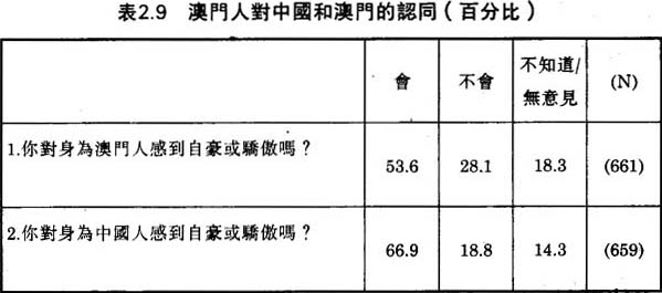 經過葡萄牙人的長期管治,澳門華人是否仍然認同於中國呢?當我們的被訪者被問及是否對身為中國人感到自豪,66.9%給予正面、肯定的答覆。這個調查結果反映出大部份的澳門人仍然認同中國、以身為中國人為榮;甚至大部份土生土長的澳門華人亦以身為中國人為榮。一些本地出生的華人指出,中國現時雖然仍然相當貧窮和落後,但是,中國近十多年來已經有了驕人的發展,足與西方列強平起平坐。不過,大部份的澳門人主要是對中國源遠流長的歷史、文化感到驕傲。