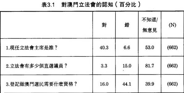 最令我們驚訝的是,當被問及立法會有多少直選議席,祇有3.3%的被訪者能夠正確答出立法會有八個直選議席。在這項調查研究開始前一個月,立法會舉行補選,選舉新增設的兩個直選席位(由六席增至八席)。競選期間五個參選團體各出奇謀、競爭激烈。各樣傳媒對各項競選活動、競選程序、立法會的組織和功能展開全面報導。所以,祇有這麽少的澳門人知悉立法會直選議席的正確數目,不能不令我們感到失望,同樣令我們失望的是澳門人普遍對選民資格無知;祇有16%的澳門人知道在澳門登記做選民,需要至少年滿18歲和在澳門居留三年或以上,③