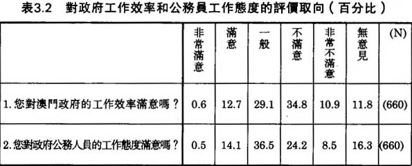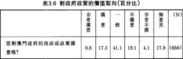 當被問及是否滿意澳門政府的施政或者政策,我們所得到的答覆比較模稜兩可。表3.6顯示,41.1%的被訪者認為政府政策“一般”,而對政府政策表示“不滿意”或“非常不滿意”的祇佔23.2%,稍多於表示“滿意”或“非常滿意”的比例(17.9%)。這調查結果反映出澳門華人對其政府的施政表現意見分歧、没有共識。一方面,澳門市民對政府官員的貪污無能表示失望;另方面,他們將過去二十年來澳門飛躍的經濟發展部份歸功於澳門政府。不過,相比之下,最少在當地居民的心目中,澳門政府的施政表現比不上中國大陸政府和香港政府。在1987年在中國進行的一次全國性調查顯示,74.7%的被訪者對政府制訂的多數政策表示滿意;⑨而在1991年在香港的一次問卷調查,有6.3%和40.3%的被訪者對香港政府的經濟政策分别表示“非常滿意”和“頗為滿意”。⑩