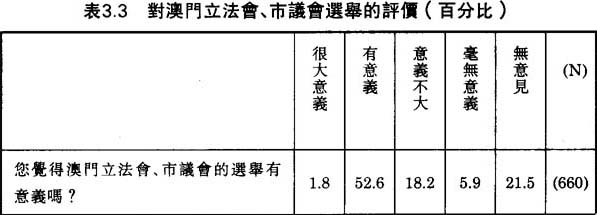 另外一條問題是查探澳門人對立法會選舉的評價。過半數(54.4%)的被訪者認為澳門的立法會和市議會選舉有“重大意義”或“有意義”;祇有24.1%的被訪者認為澳門的選舉“意義不大”或“毫無意義”;21.5%“無意見”(見表3.3)。由於對選舉的正面評價有助於一個民主政制的運作,我們很有興趣深入瞭解其中原因。衆所周知,澳門立法會並不掌握全部立法權;它的立法權力被澳門總督分薄和限制。為什麽澳門人重視這樣一個“跛腳鴨”式的立法機關呢?當我們與部份被訪者深入交談,我們發覺澳門人對立法會所扮演的角色有一較特殊的理解。他們似乎没有認識到立法會的主要功能是立法;他們祇期望有一個他們可以信任、委託的機構,向政府有關部門傳達他們的投訴和要求。立法會被澳門人普遍視為官民溝通的主要橋樑。而立法會議員,尤其是直選議員,亦熱衷於扮演這個“橋樑”角色,紛紛設立議員辦事處,幫助澳門市民辦理申請經濟房屋、身份證、屋契等等與日常生活切身有關的事務。因此,立法會議員的行為間接誤導市民,加深了市民對立法會主要功能或角色的誤解。誠然,立法議員的“橋樑”角色正好迎合澳門華人的政治文化取向——對政治的現實觀,即以政治參與為手段以期達到改善個人物質生活的目的。難怪1992年的立法會選舉,有接近六成的註册選民投票,比香港的立法局選舉要高,亦不遜於西方民主國家的地方選舉。而且,為迎合市民心理,立法會議員侯選人,在競選期間,祇強調如何改善民生,絶少提及政治或民主理想。對“有怎樣的人民,就有怎樣的政府”這個説法,如以“立法會”代替“政府”,這個説法是頗合澳門實際政情的。