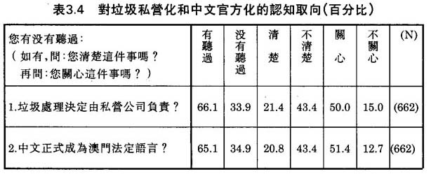 我們設計了三條問題去查訪澳門華人對政治體系“輸出”的認知取向。第一條問題是澳門人人關心的有關垃圾處理的方法。澳門的垃圾處理,是一個久已存在的問題。任何第一次到澳門的旅客,若稍為留意,不會不察覺堆積街道的垃圾。負責街道清潔的市政廳,不祇一次的在市政議會討論解決、改善垃圾處理方法,以妀變澳門市容,最後於1991年決定將收集、處理垃圾的工作交由私人專營公司負責。這個決定曾經在澳門社會、傳媒中引起很大的爭論,一般對垃圾處理私營化能否最終解決問題抱著懷疑的態度。由於澳門垃圾的問題嚴重及其直接影響到市民的日常生活,對於有三分之二的被訪者曾“聽過”垃圾私營化這個決定,我們並不感到驚訝(見表3.4)。而且,曾經“聽過”垃圾私營化這個政府決定的被訪者,超過半數表示關心這個問題。