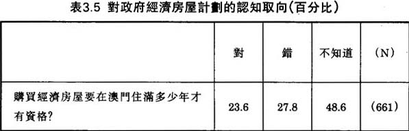 第三條問題問:購買經濟房屋要在澳門住滿多少年才有資格?表3.5顯示,超過四分之三的被訪者不知道(或答錯)必須在澳門住滿五年才有資格申請購買政府經濟房屋;祇有23.6%答對。對這個調查結果我們有些驚奇,因為大部份被訪者符合經濟房屋規定的經濟條件和居留期條件。⑧不過,令我們“驚奇”的調查結果,可能出於問卷本身的設計。問被訪者有否“聽過”政府某項政策或決定是一回事,問他們有關某項政府政策的“內容”又是另一回事。我們相信大部份的澳門人曾經“聽過”政府的經濟房屋計劃,但是,可能祇有小部份“清楚”這個計劃的內容;正如大部份的澳門人“聽過”垃圾私營化和中文官方化這兩個政府決策,但是祇有五分之一“清楚”其政策內容。如果我們將澳門人對申請購買經濟房屋的資格的認知,同他們對立法會直選議席、登記澳門選民所需的資格的認知比較,事情就最清楚不過了,澳門人對前者的認知明顯的高於後者。説到底,澳門一般市民對政府政策(即政治體系的“輸出”)的關心程度,尤其是與他們切身問題有關的決策,高於對政府組織架構或決策過程(即政治體系的“輸人”)的關心。