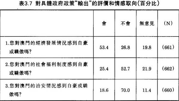 我們又另外設計了三條問題,去查探澳門市民對具體政府政策的評價和情感取向。第一條問題涉及澳門的經濟發展情況。表3.7顯示,超過一半(53.4%)的被訪者對澳門的經濟發展情況感到自豪或者驕傲。這調查結果並不令我們驚奇。過去二十年,澳門經濟的高速增長,成就有目共睹。如以1991年人口普查的354,000人計算,1991年澳門人均國民生產總值達10,300美元,超過南韓和台灣,位居亞洲第五,這是一個了不起的成就。無怪乎無論是澳門的老居民或新移民都以澳門的經濟成就為榮。一個十年前由大陸遷徙來澳門的新移民向我們訴説他的經歷: