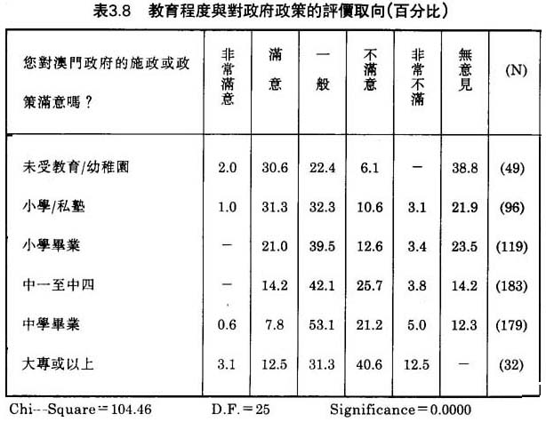 有關被訪者的背景因素,我們發覺被訪者的教育程度和在澳門的居留年期,對他們對政府政策“輸出”的評價和情感取向有一定程度的影響。我們發覺教育程度與對政府政策的滿意程度有相反的關係。表3.8顯示,32.6%未受過教育和32.3%祇有小學程度的被訪者,對澳門政府的施政或政策表示“滿意”或“非常滿意”;但是,祇有8.4%受過中學教育的和15.6%受過大專或以上教育的被訪者對政府政策感到滿意。受過高深教育的被訪者,一般對政府的施政能力抱懷疑和批評的態度。譬如,超過半數(53.1%)受過大專以上教育的被訪者對政府政策表示“不滿意”或“非常不滿”;祇有6.1%未受過教育的被訪者持相同的態度。