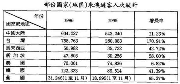 1996年的澳門旅遊業可說是喜憂參半。全年的入境旅客爲8,151,055人次,打破了多年來徘徊不前的局面,創下了歷史新高。這個數字與1995年比較,有5.1%的增長,是90年代以來增幅最高的一年。旅遊司公佈的資料顯示,去年旅客消費總額爲270億澳門元,較前年增加9%,其中用於住宿、購物、膳食及交通等項目的消費爲115億,增幅高達42%,而用於博彩的消費爲157 億澳門元,較前年下降6%,是多年來首次出現的下跌現象。