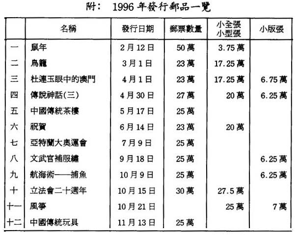 1996年澳門郵電司發行了12套郵票:7枚小全張及1枚小型張,5張小版張。依數量來說,可算不少。