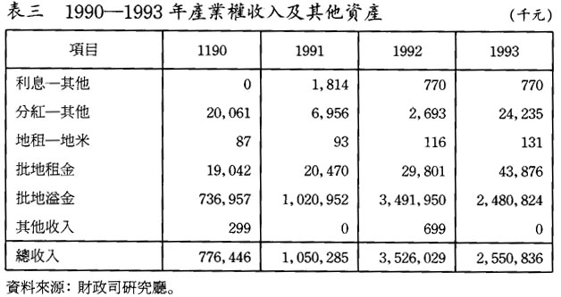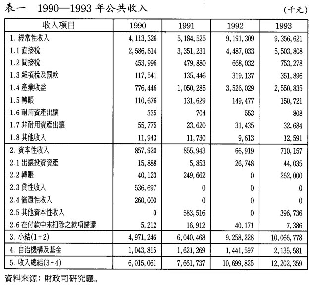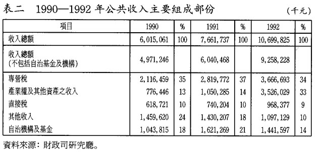 澳門公共收入包括“經常性收入”,“資本性收入”及“自治機構及基金”。從表一可看出總地區收入有持續增長,例如1992年至1993年間便增長了14%。表二顯示出公共收入的主要組成部份。其中專營稅佔公共收入結構的最主要部份,1990年佔35%,1991 年佔37%,1992年佔34%。專營稅包括博彩稅及公用事業專營稅,而前者佔總專營稅的最大比重,如在1992年便佔總專營稅的97%。在1992年,產業權及其他地產收入佔總公共收入的33%,該項收益主要來自批地溢金表三。因此,從表二可看到在1992年“專營稅”及“產業權及其他資產收入”兩項收益已佔去總地區收入的67%,直接稅祇佔總地區收入的一小部份,1990年佔10.3%,1991年佔9.7%,1992年佔9.1%,1993年回升至佔9.6%(表四)。