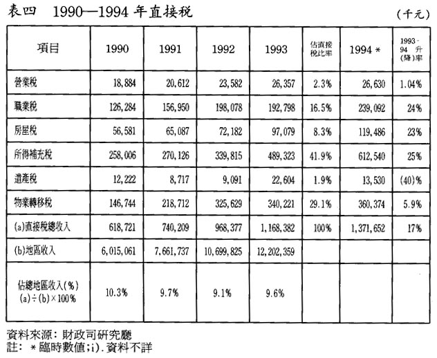 由於1994年資料祇是臨時數據,因此我們以1993年爲例,探討每一種稅項在直接稅的重要性。(參閱表四)