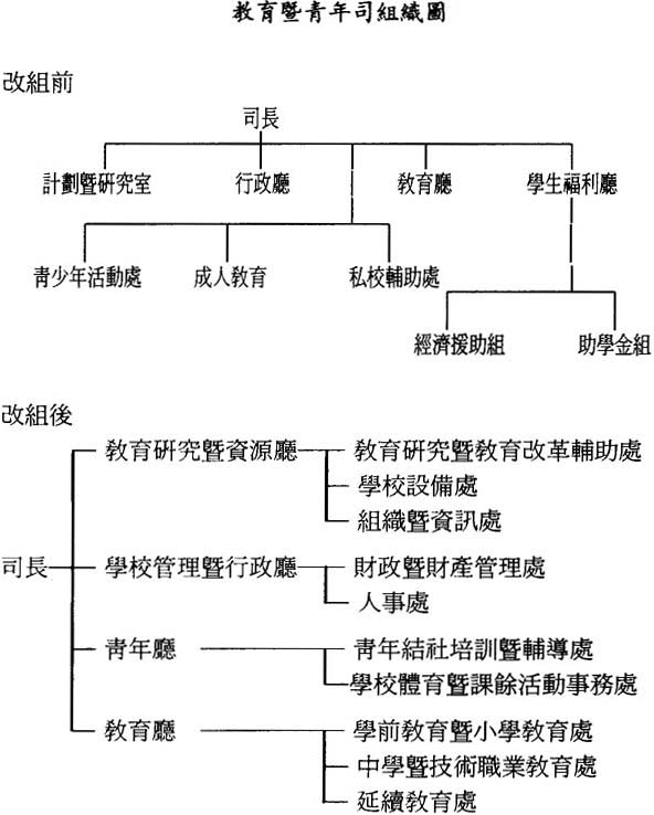 敎育改革除了需要有未來的藍圖——敎育制度,以及實施敎改的法律手段——各敎育法規以外,還需要有策劃和執行敎育改革的部門,敎育行政的改革,往往要先於敎育改革,或者要放在敎育改革的前期。因此,1992年底,負責非高等敎育的行政部門——敎育司改組成爲今天的敎育暨青年司。將原來四個廳級部門重組,把計劃暨研究室改組爲教育研究暨資源廳,撤消學生福利廳,成立青年廳,此外還設立十一個處級部門,這些原有的和改組後增加的部門所服務的對象,由集中於官立學校擴充爲服務至全澳官私立學校,因此,原有的私校輔助處被撤消,其職能分散在各廳處級單位內。