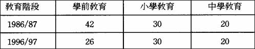 敎育投入是敎育改革重要的組成部分,敎育投入不單是一個多與少,足夠與不足夠的問題,還涉及到敎育公平,尤其是敎育資源分配的問題,以往社會人士多以本澳資源分配不合理和不公平爲垢病,批評行政當局的社會政策,當中包括敎育事務方面。然而,自從敎育改革以來,敎育行政部門的預算,從1989年2.07億元,增加至1999年超過10億元,十年間增加了五倍。由佔總預算7.6%上升至10%左右。