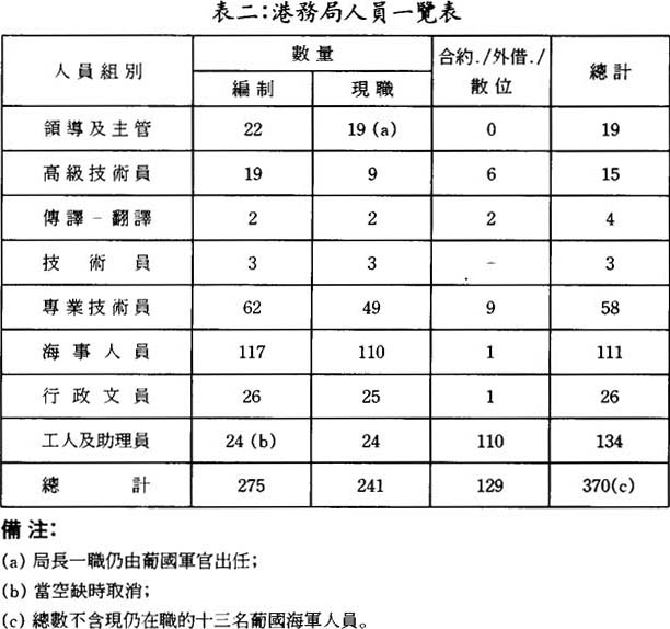 至於人員的配置,過去的情況如其他政府部門一樣,中、高層及專業人員一直由葡萄牙調派來澳,而絕大部分來自海軍各部門,自軍官級、中士乃至下士,來澳任期爲數年,不斷替換,當然亦有個別軍人落地生根,長時間留澳服務。