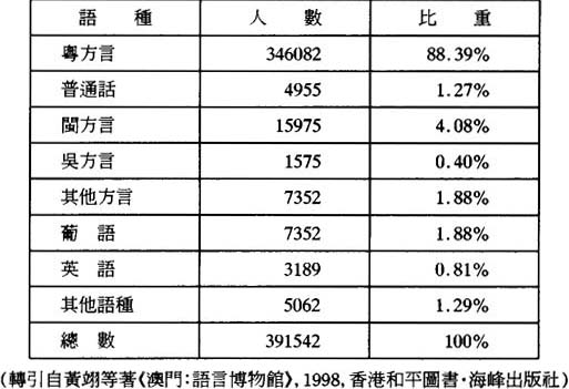 澳門是一個多語多言的“語言博物館”式的袖珍城市,人口雖然不過40多萬,語言和方言的數量卻比隔海相望的香港複雜得多。香港六百多萬人口,語言狀況卻較澳門單純得多。香港主要有漢、英兩種語言,漢語中粵方言勢力獨大,英語適用面很廣。在香港,有了粵語和英語就可以“通行無阻”。香港在回歸前英語勢力強大,回歸後中文正在急起直追,當然阻力很大,主要是傳統的偏見不小,但也不必諱言英語的競爭力強,因而學習者衆。澳門的語言狀況要比香港複雜,她是葡語、漢語和英語共存的三語社會,(此外還有泰語、緬甸語、印尼語、菲律賓語、日語等等。)而在漢語內部,方言的分歧也相當嚴重,除了有強勢的粵方言,還有人口不算少、勢力也不算弱的閩方言、吳方言等等。據一份資料顯示,在澳門流通的各種語言和方言的比例是: