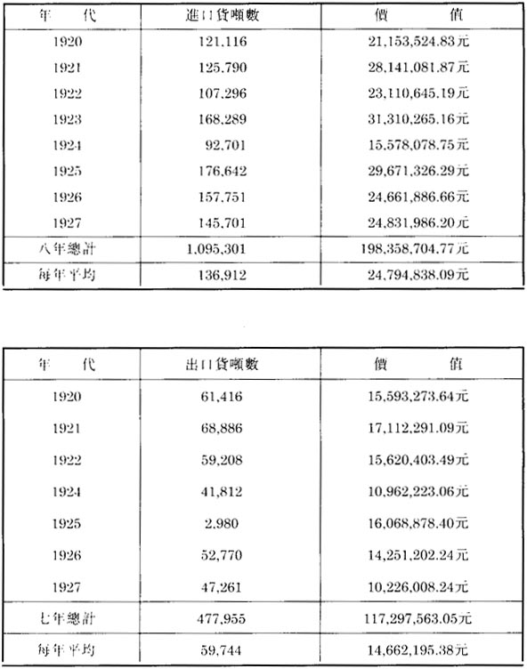 我覺得此處可將1920年到1927年間澳門進出口的數字,記錄下來(見下頁)。這種數字,可以表示澳門的活動力,又可以充做人口所以能夠迅速增長的理由。