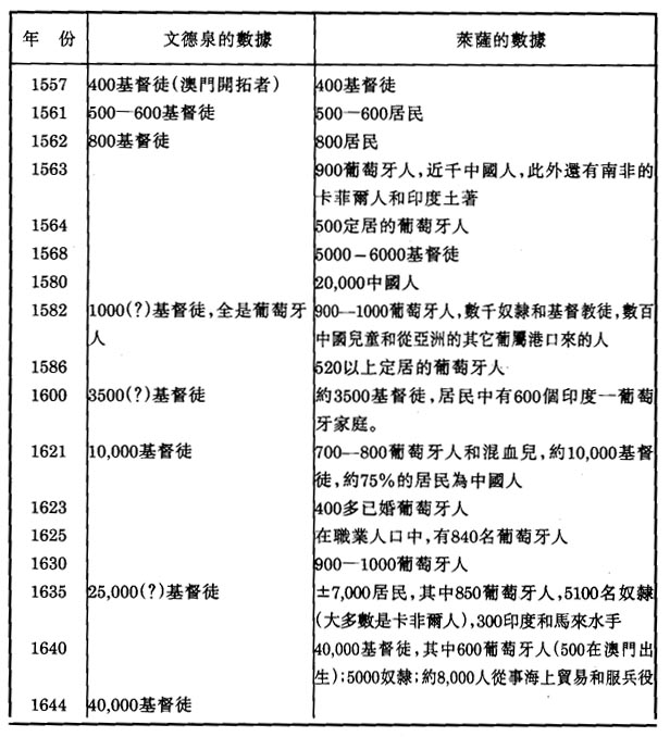 鑒於形形色色的種族和民族混雜的情況,首先要求列出一些表示葡萄牙人所佔份額的數字。平托(Pinto)説,在寜波附近的雙嶼島(Liampó)有2000葡萄牙人,在漳州(Chincheu)有600人,在浪白澳(Lampacau)有500-600人。後兩個數字完全切合實際,而有關雙嶼的數字,因該地的歷史尚有不淸楚之處,估計遠遠少於2000人。